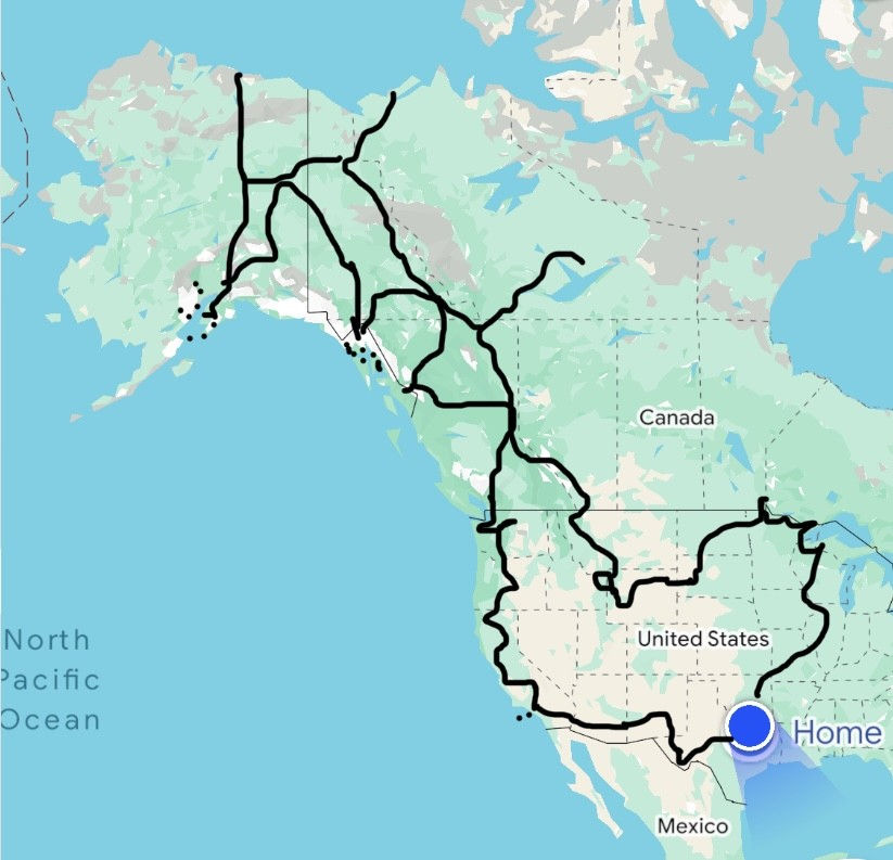 The road trip from Dallas, Texas to Alaska and back to Dallas. 22,500 miles including the whole 1,450 miles of Alaska Highway and other remarkable routes, as: Dalton, Klondike, Dempster, Top of the World, and Glacier highways.